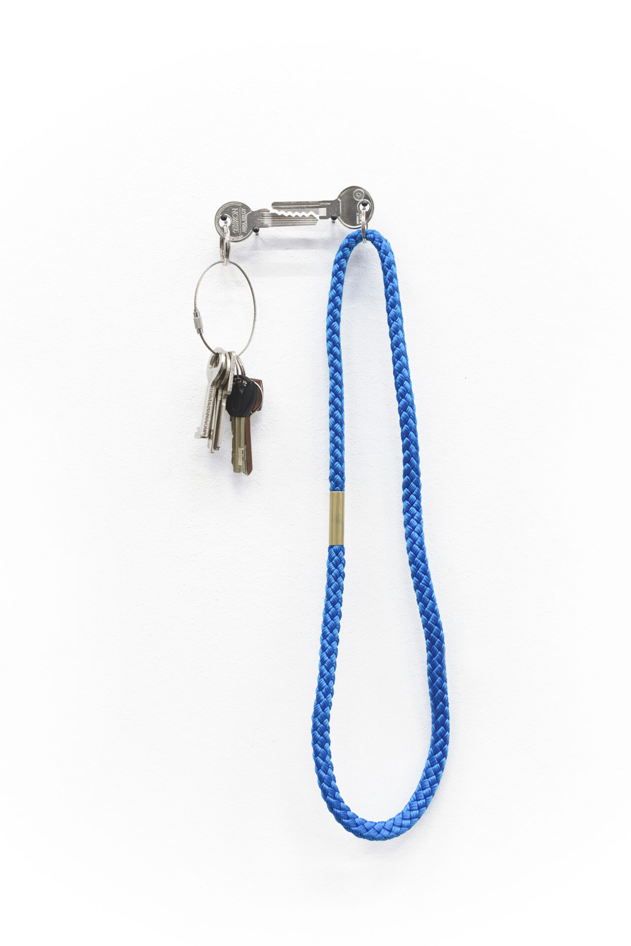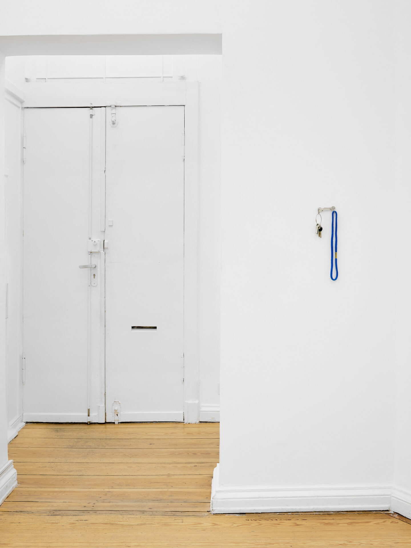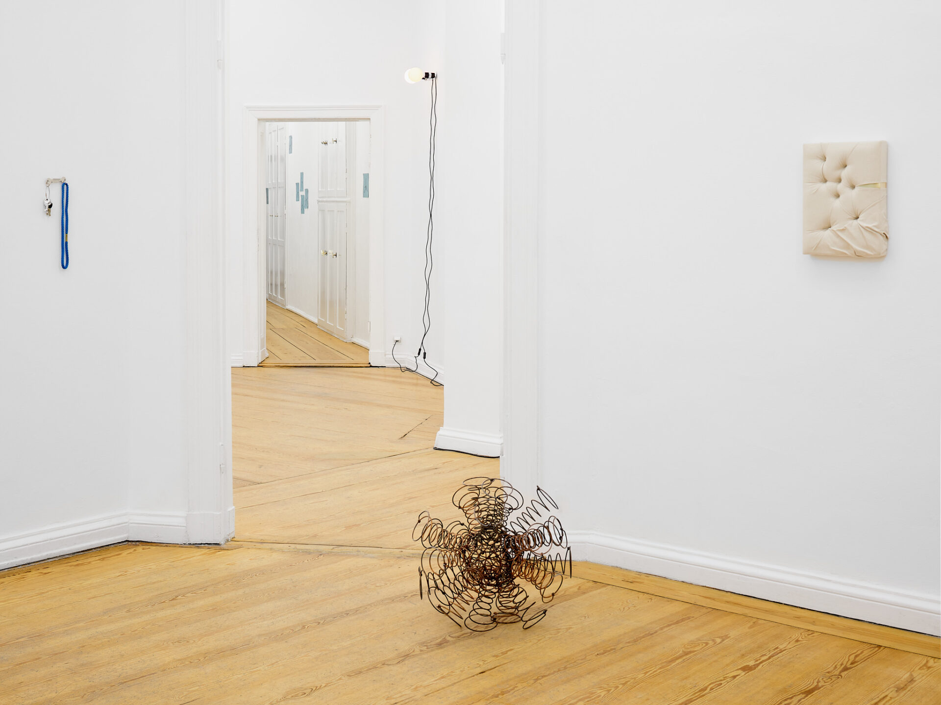Through the abstract representation of corporeality, visitors are thrown back onto their own physicality within the exhibition space. They find themselves not only in a gallery, but also in a former apartment into which the exhibition space is embedded. This domestic aspect played a role in the selection of certain works, as my aim was to reflect the individual within their own four walls – at a place where bodily experiences, emotions, and perceptions of love condense in a particular way, whether through cohabitation with a partner, the experience of heartbreak, or the handing over of a second apartment key as a defining moment in the course of a relationship. Thus, BETWEEN US (2020) by Katja Aufleger – her own key ring – is located directly next to the entrance door. One of the keys is opposed by an exact puzzle piece. This supposedly ideal counterpart, however, cannot open any lock; it serves no function. Does the perfect match even exist? With her two works, Katja Aufleger assembles objects we carry close to our bodies: phone, lighter, keys. A reminder to remain mindful of what we carry with us – and never to rely entirely on others.