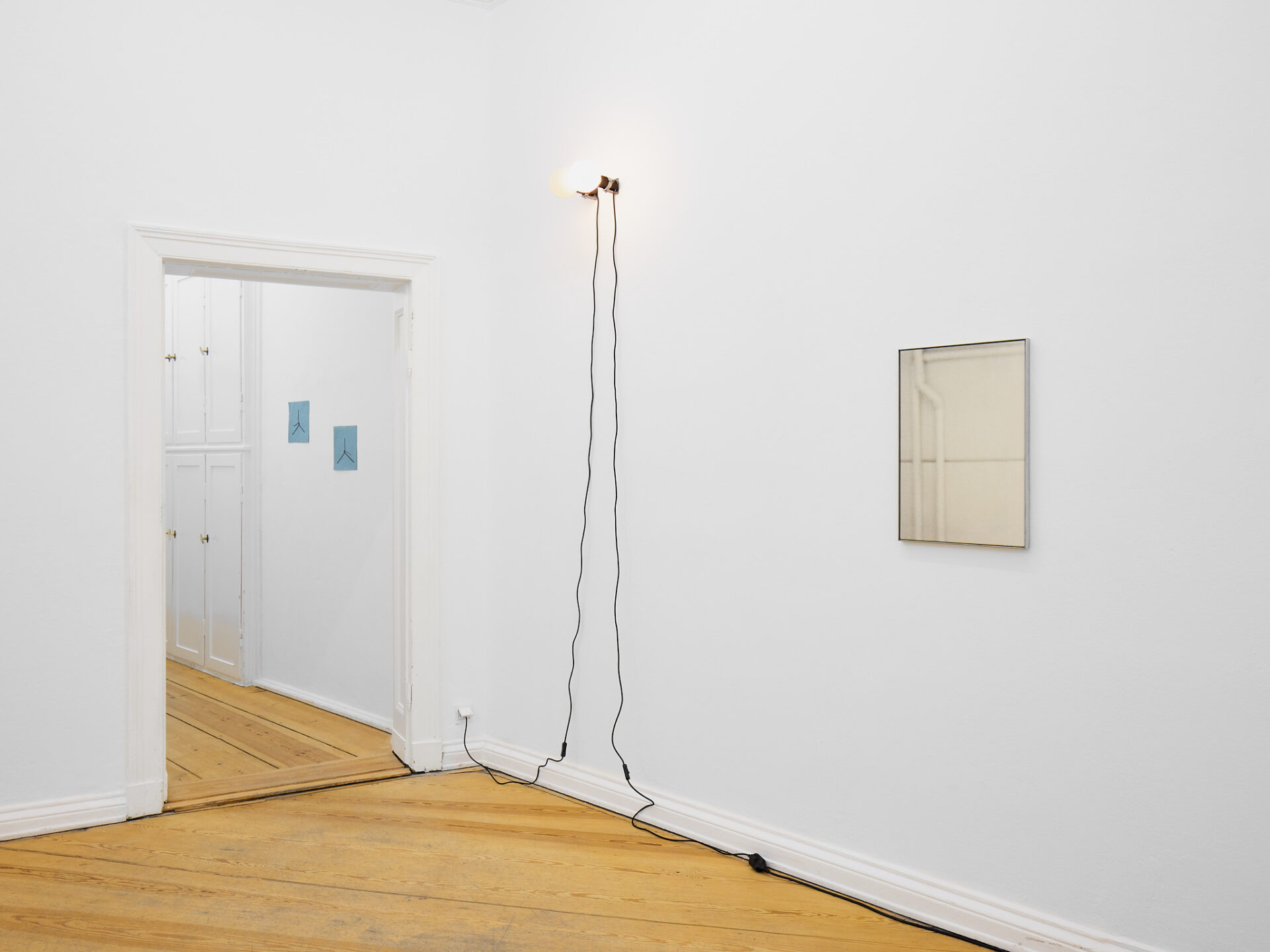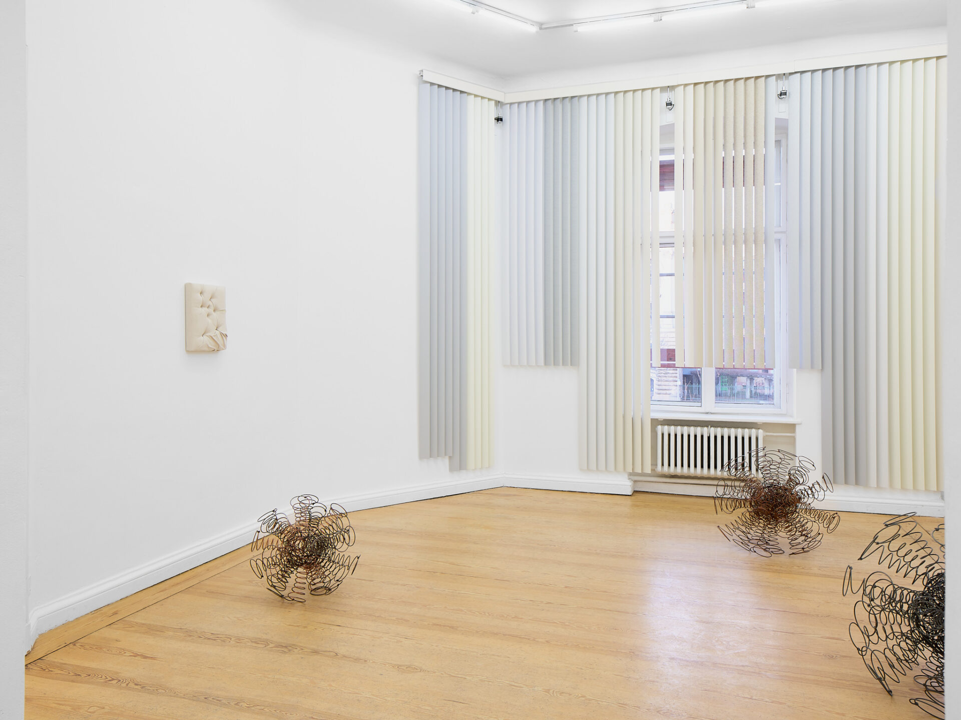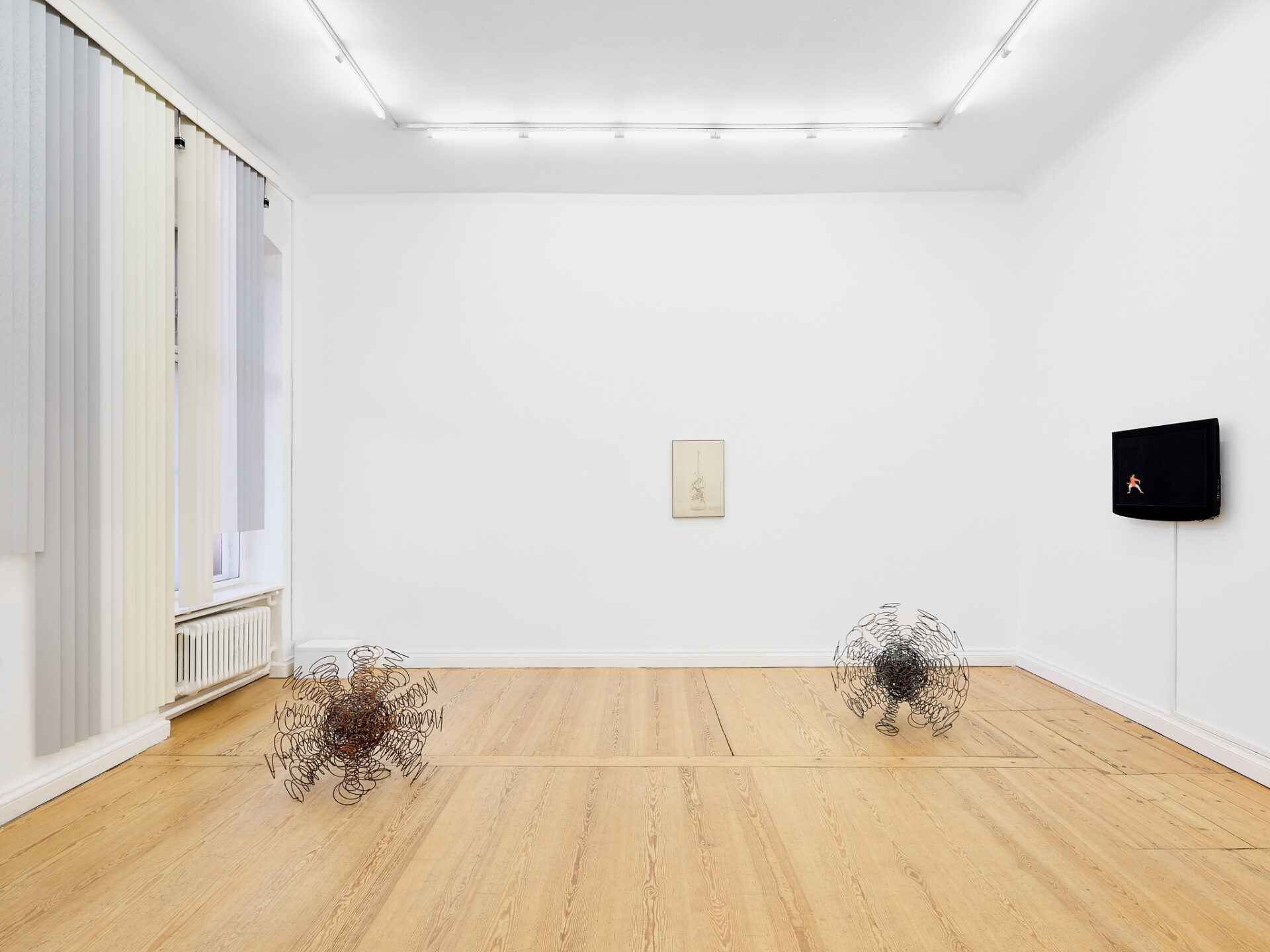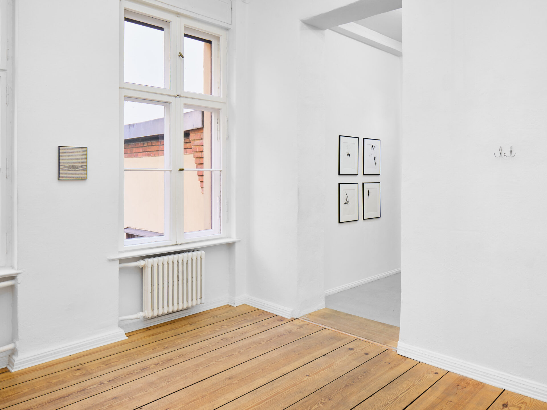 Even though the selected works in the exhibition rarely depict the human body directly, bodily experience nonetheless plays a central role. Nicolás Astorga presents There’s a stone in my chest (2024–2026), a heart pierced by arrows. Referencing Saint Sebastian, the wall sculpture visualizes a feeling of heaviness and pain. The mineral coal stone was found by the artist already in the shape of a heart and lovingly fitted with steel arrows. Elsewhere, Cupid seems to have struck: a Cockring (2020) is fixed to the wall by another arrow that might just have been shot through the window. Monilola Olayemi Ilupeju presents moments of masturbation in drawings from her ongoing Body Print Series, for which she used charcoal on paper during self-pleasure (Masturbation Studies 1–5, 2022). Her orgasm(s) is/are traced as an abstract-expressionist rendering on the partially torn sheets, while self- love receives a special form of appreciation through classical framing with a passe-partout. Friedrich Andreoni, in Two figures and one anchor point series (2024), tells of the endless constellations that two bodies can enter into with one another. On each sheet of the series, two nearly identical forms are drawn, engaging in a relationship with each other in constantly shifting ways and searching for their shared point of stability. Hanging freely along the gallery’s long corridor, they appear suspended in a state of levitation, as if they might find one another like in a game of Tetris or lift upward in free motion. Ziva Drvaric, in turn, visualizes inner emotional states in poetically inflected screen prints on natural linen as well as in installations made of everyday objects. In Inward II (2026), a eucalyptus branch unfolds inside an empty bottle, seemingly stuck in a hopeless situation. In Thoughts (2023), two bodies – here, two pipes – nestle against each other only to separate again shortly thereafter. In To and From (2025), two light bulbs share warm light in a balanced interplay. With a sensitive eye for what surrounds us, these works speak of situations of togetherness and isolation.