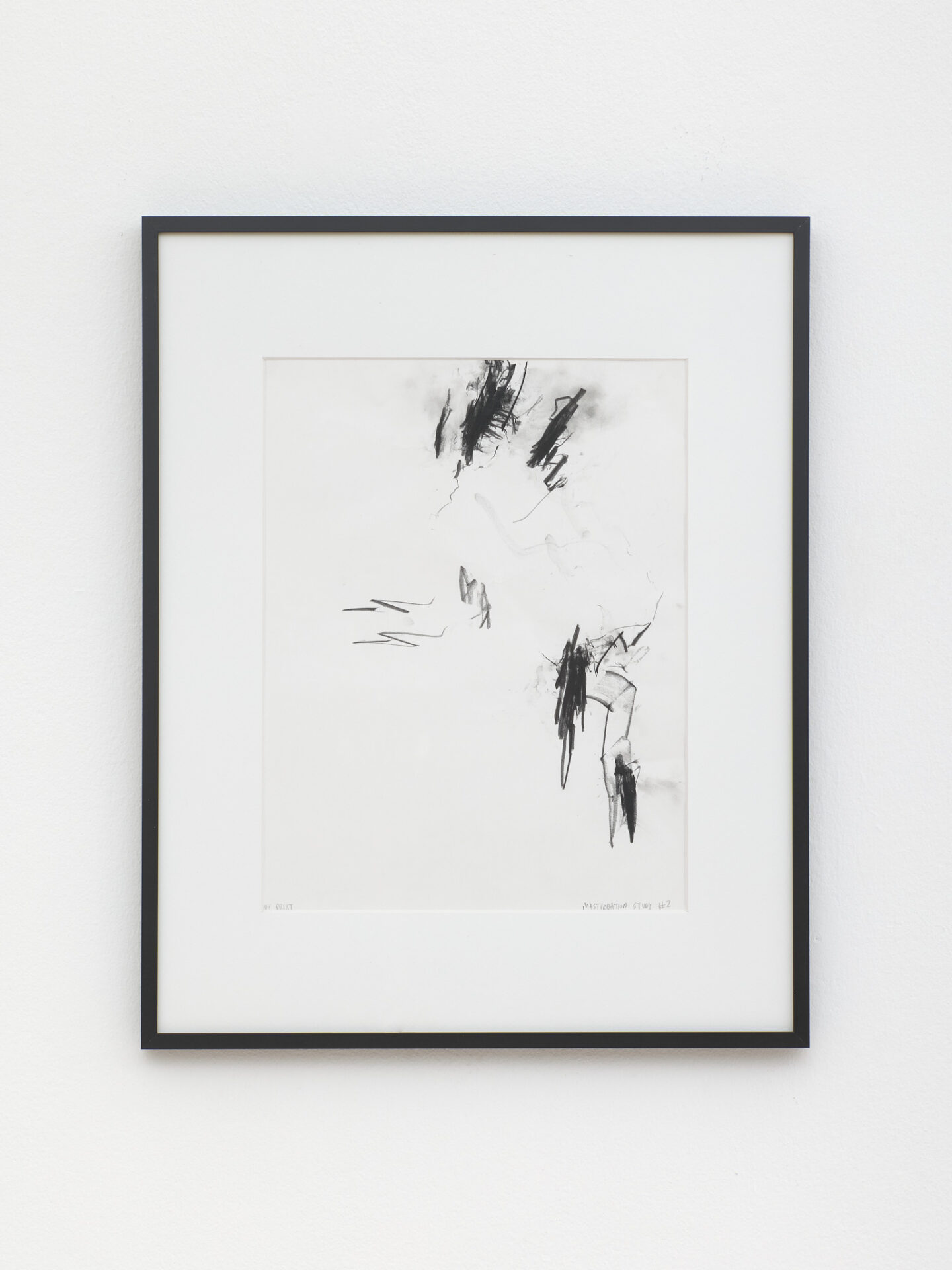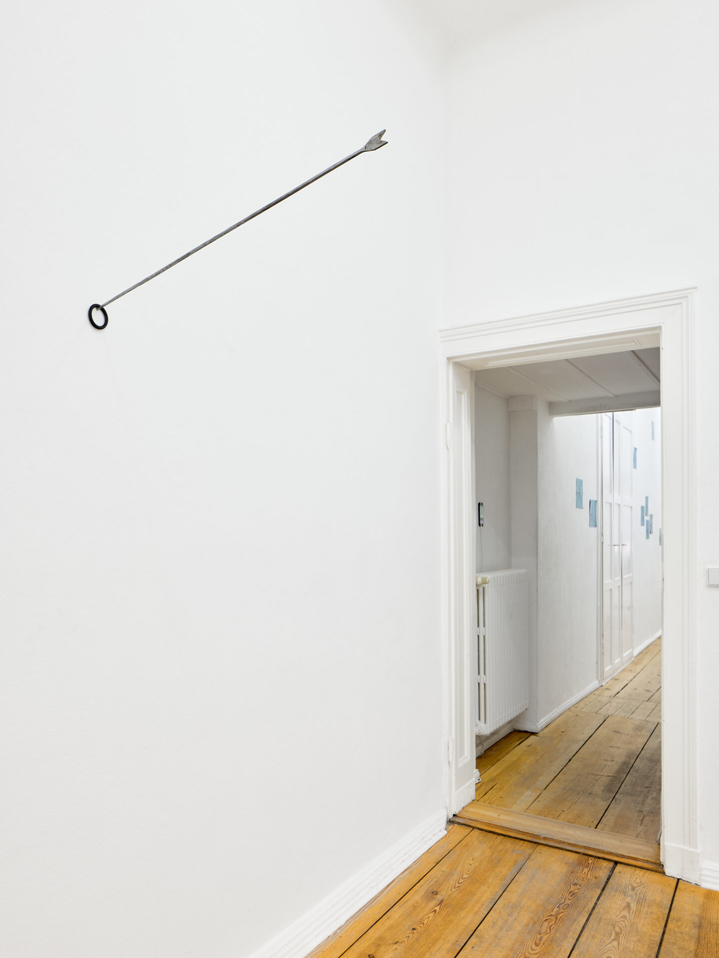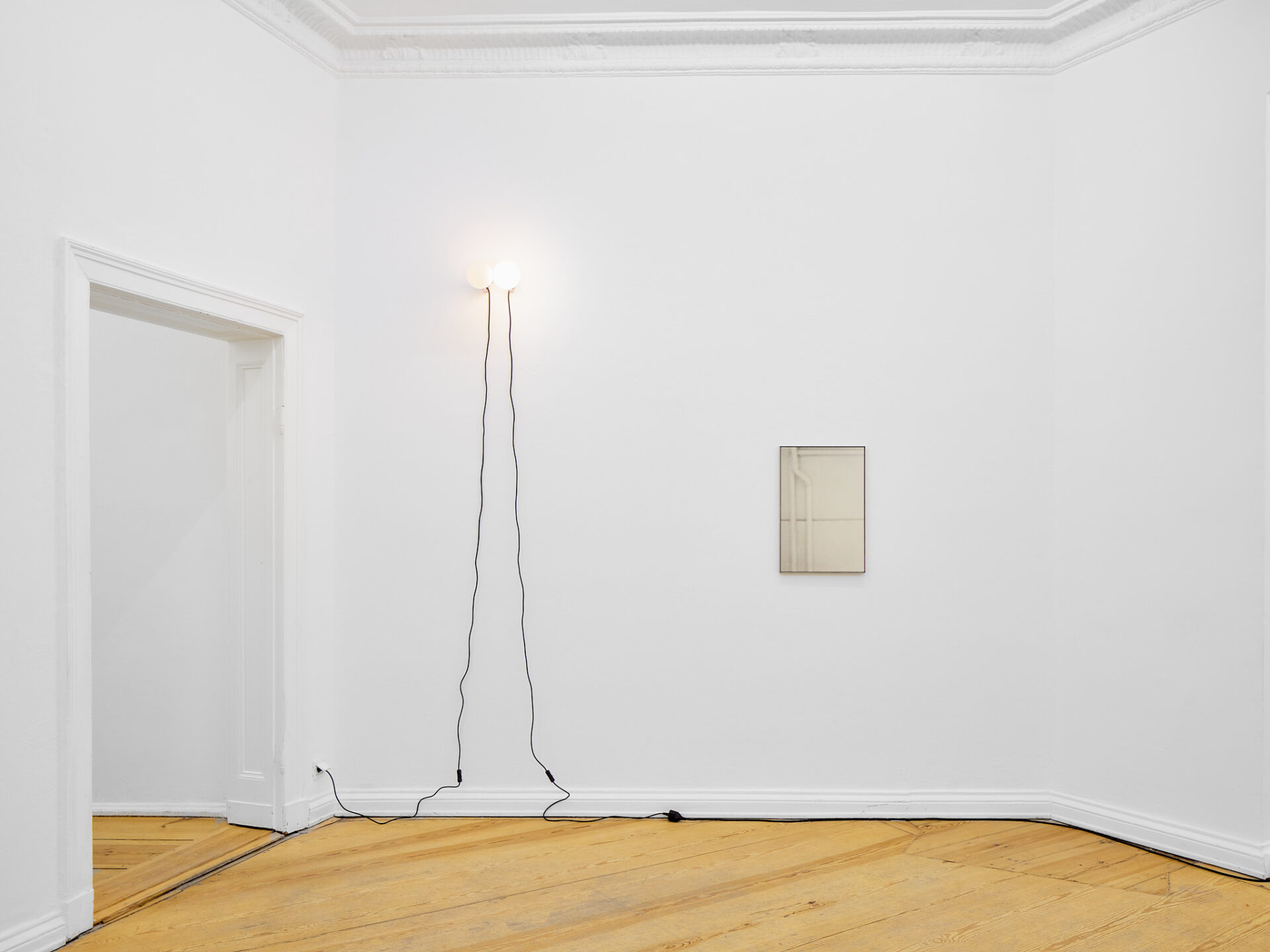 Even though the selected works in the exhibition rarely depict the human body directly, bodily experience nonetheless plays a central role. Nicolás Astorga presents There’s a stone in my chest (2024–2026), a heart pierced by arrows. Referencing Saint Sebastian, the wall sculpture visualizes a feeling of heaviness and pain. The mineral coal stone was found by the artist already in the shape of a heart and lovingly fitted with steel arrows. Elsewhere, Cupid seems to have struck: a Cockring (2020) is fixed to the wall by another arrow that might just have been shot through the window. Monilola Olayemi Ilupeju presents moments of masturbation in drawings from her ongoing Body Print Series, for which she used charcoal on paper during self-pleasure (Masturbation Studies 1–5, 2022). Her orgasm(s) is/are traced as an abstract-expressionist rendering on the partially torn sheets, while self- love receives a special form of appreciation through classical framing with a passe-partout. Friedrich Andreoni, in Two figures and one anchor point series (2024), tells of the endless constellations that two bodies can enter into with one another. On each sheet of the series, two nearly identical forms are drawn, engaging in a relationship with each other in constantly shifting ways and searching for their shared point of stability. Hanging freely along the gallery’s long corridor, they appear suspended in a state of levitation, as if they might find one another like in a game of Tetris or lift upward in free motion. Ziva Drvaric, in turn, visualizes inner emotional states in poetically inflected screen prints on natural linen as well as in installations made of everyday objects. In Inward II (2026), a eucalyptus branch unfolds inside an empty bottle, seemingly stuck in a hopeless situation. In Thoughts (2023), two bodies – here, two pipes – nestle against each other only to separate again shortly thereafter. In To and From (2025), two light bulbs share warm light in a balanced interplay. With a sensitive eye for what surrounds us, these works speak of situations of togetherness and isolation.