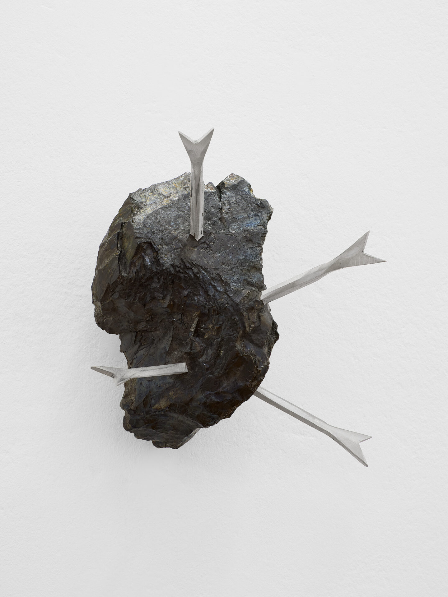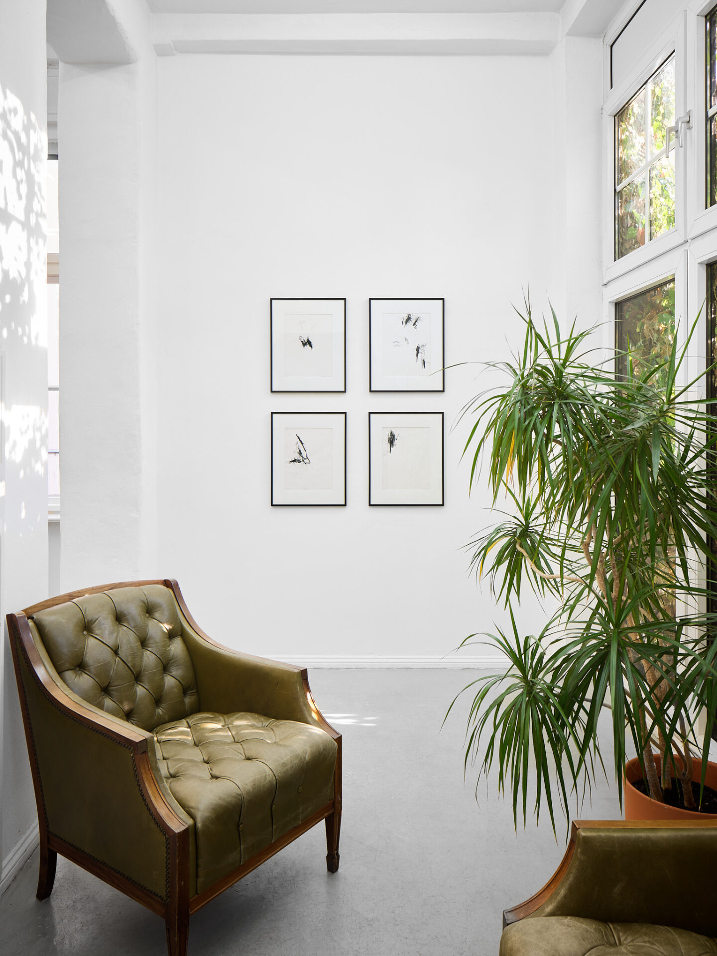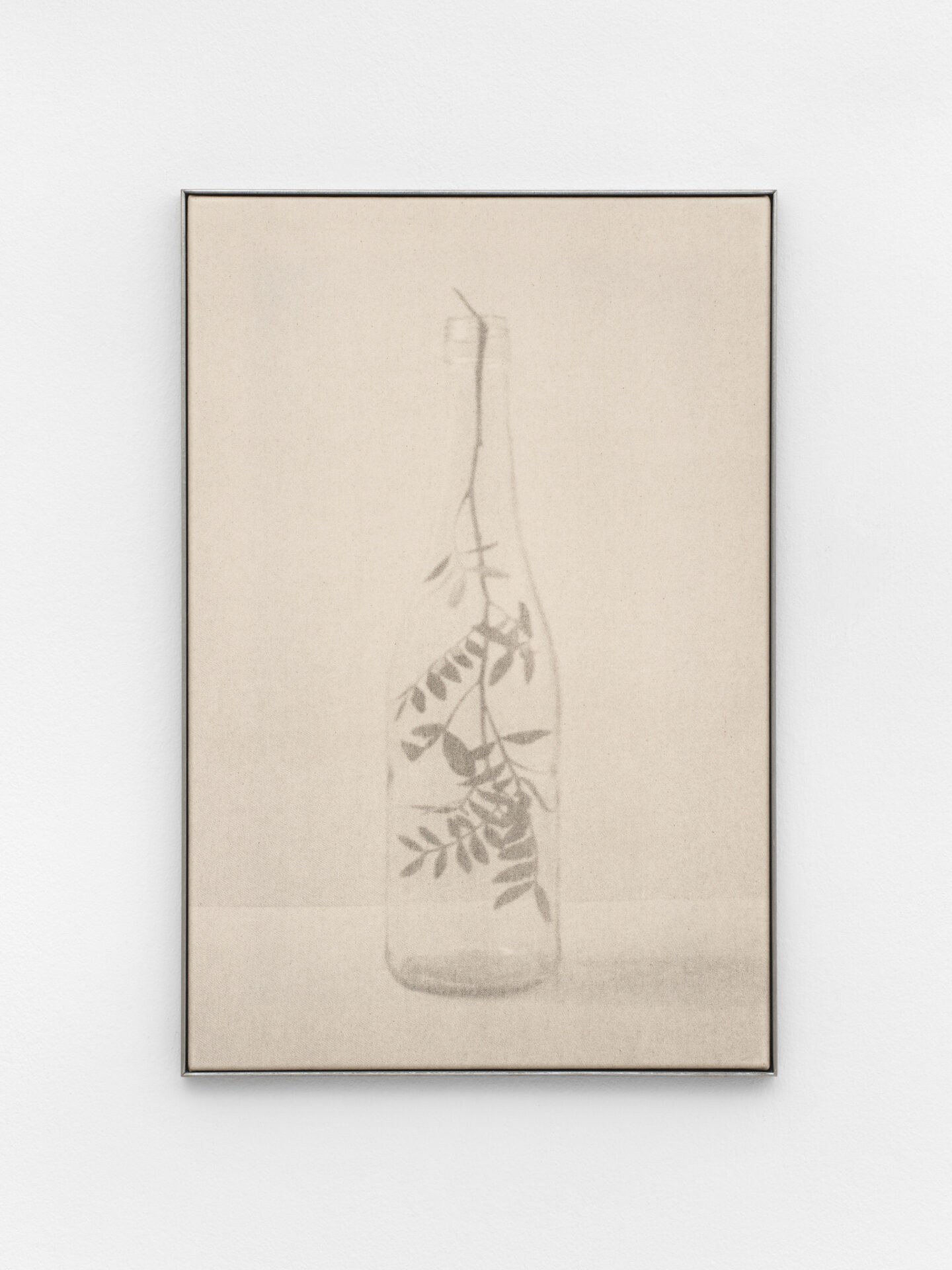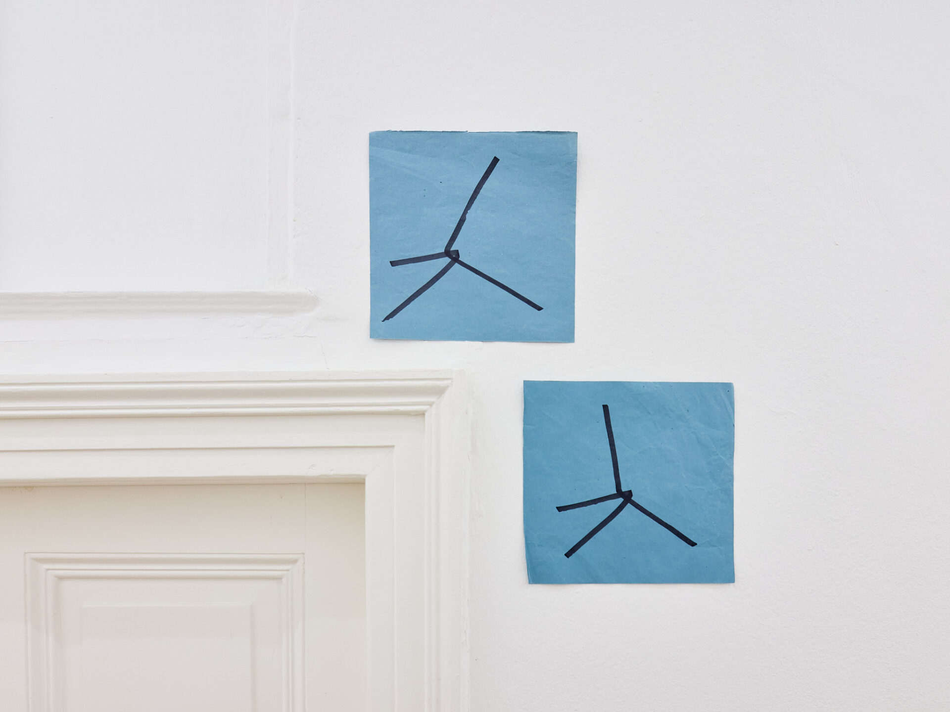 Even though the selected works in the exhibition rarely depict the human body directly, bodily experience nonetheless plays a central role. Nicolás Astorga presents There’s a stone in my chest (2024–2026), a heart pierced by arrows. Referencing Saint Sebastian, the wall sculpture visualizes a feeling of heaviness and pain. The mineral coal stone was found by the artist already in the shape of a heart and lovingly fitted with steel arrows. Elsewhere, Cupid seems to have struck: a Cockring (2020) is fixed to the wall by another arrow that might just have been shot through the window. Monilola Olayemi Ilupeju presents moments of masturbation in drawings from her ongoing Body Print Series, for which she used charcoal on paper during self-pleasure (Masturbation Studies 1–5, 2022). Her orgasm(s) is/are traced as an abstract-expressionist rendering on the partially torn sheets, while self- love receives a special form of appreciation through classical framing with a passe-partout. Friedrich Andreoni, in Two figures and one anchor point series (2024), tells of the endless constellations that two bodies can enter into with one another. On each sheet of the series, two nearly identical forms are drawn, engaging in a relationship with each other in constantly shifting ways and searching for their shared point of stability. Hanging freely along the gallery’s long corridor, they appear suspended in a state of levitation, as if they might find one another like in a game of Tetris or lift upward in free motion. Ziva Drvaric, in turn, visualizes inner emotional states in poetically inflected screen prints on natural linen as well as in installations made of everyday objects. In Inward II (2026), a eucalyptus branch unfolds inside an empty bottle, seemingly stuck in a hopeless situation. In Thoughts (2023), two bodies – here, two pipes – nestle against each other only to separate again shortly thereafter. In To and From (2025), two light bulbs share warm light in a balanced interplay. With a sensitive eye for what surrounds us, these works speak of situations of togetherness and isolation.