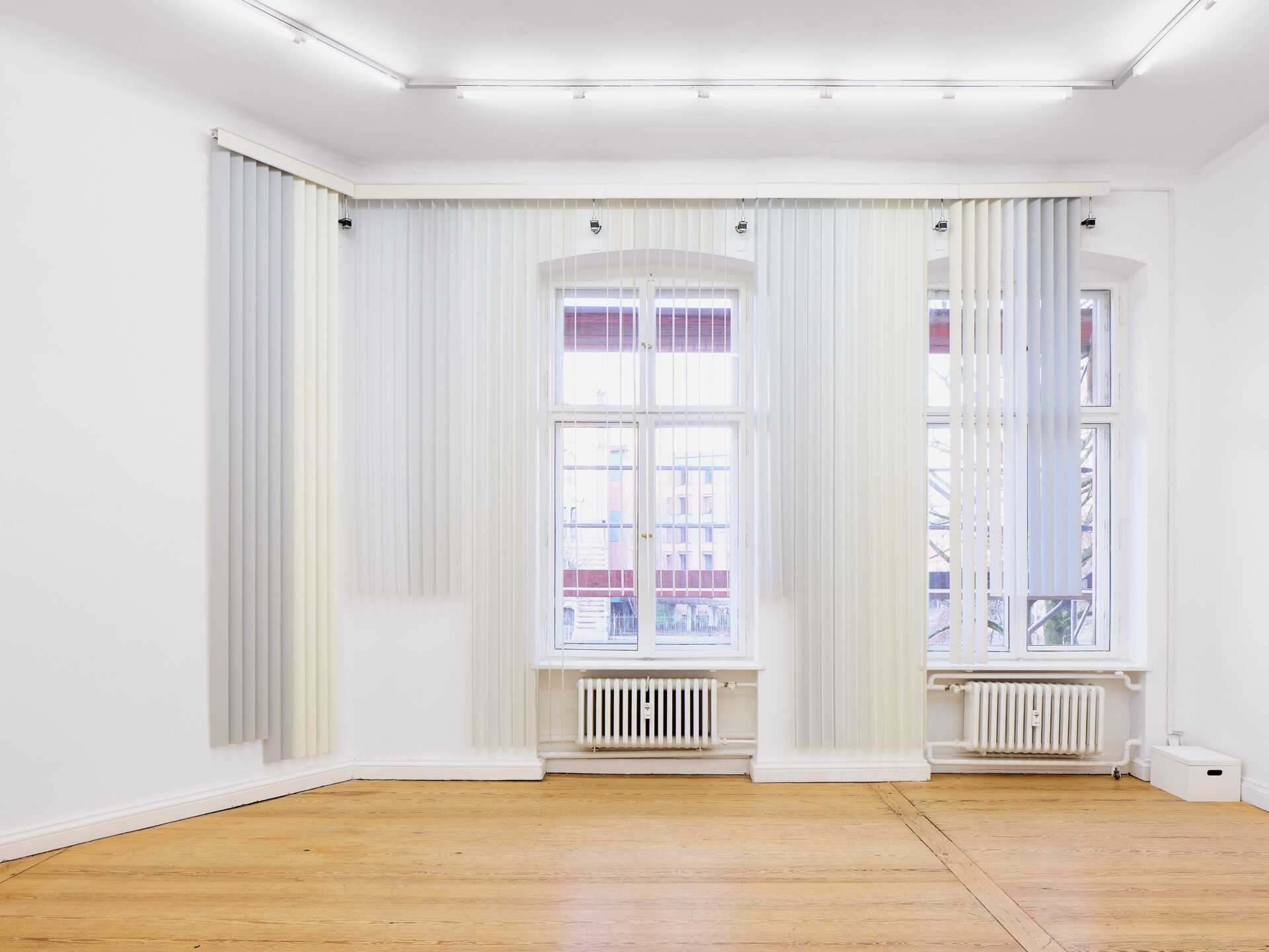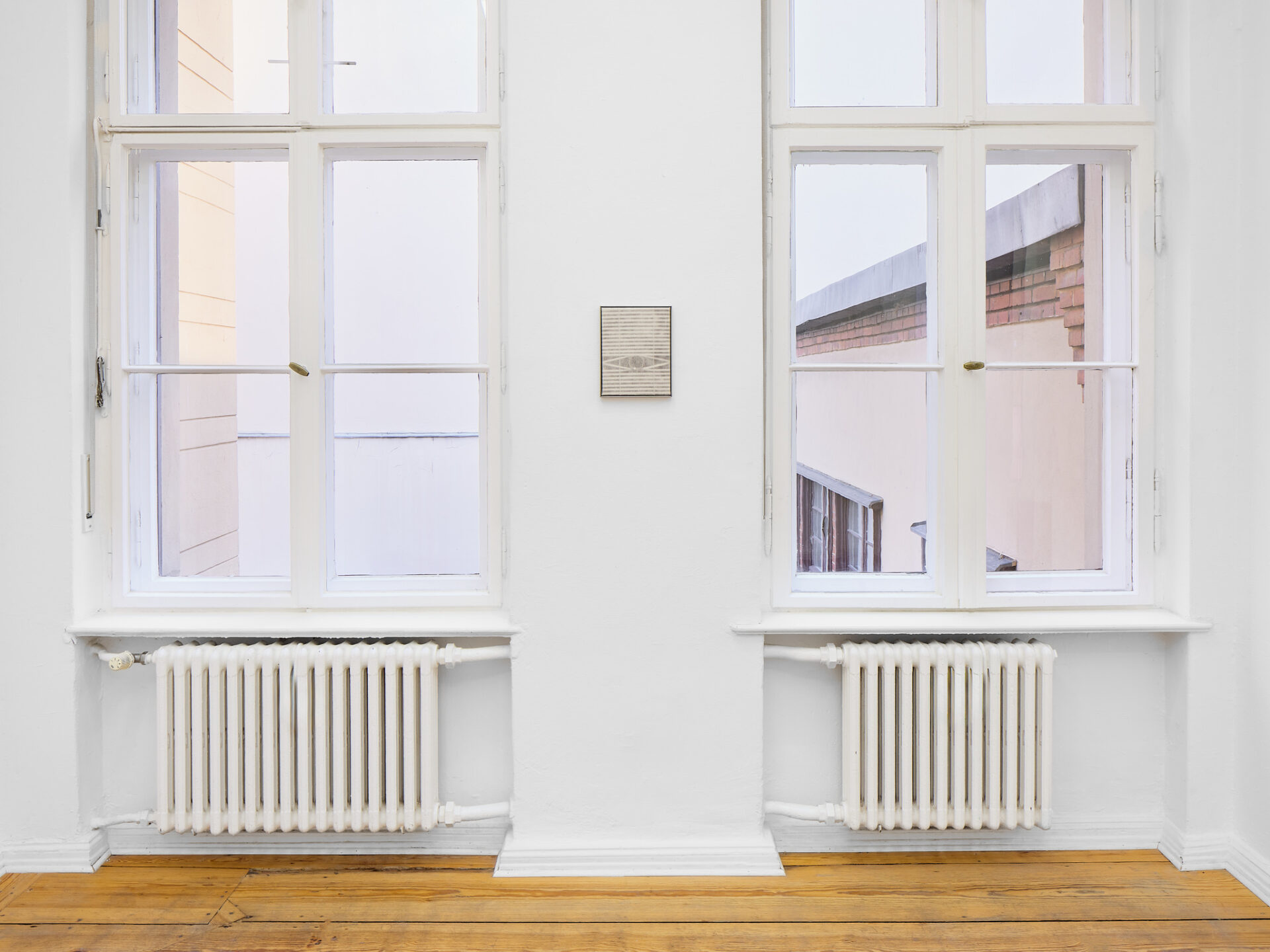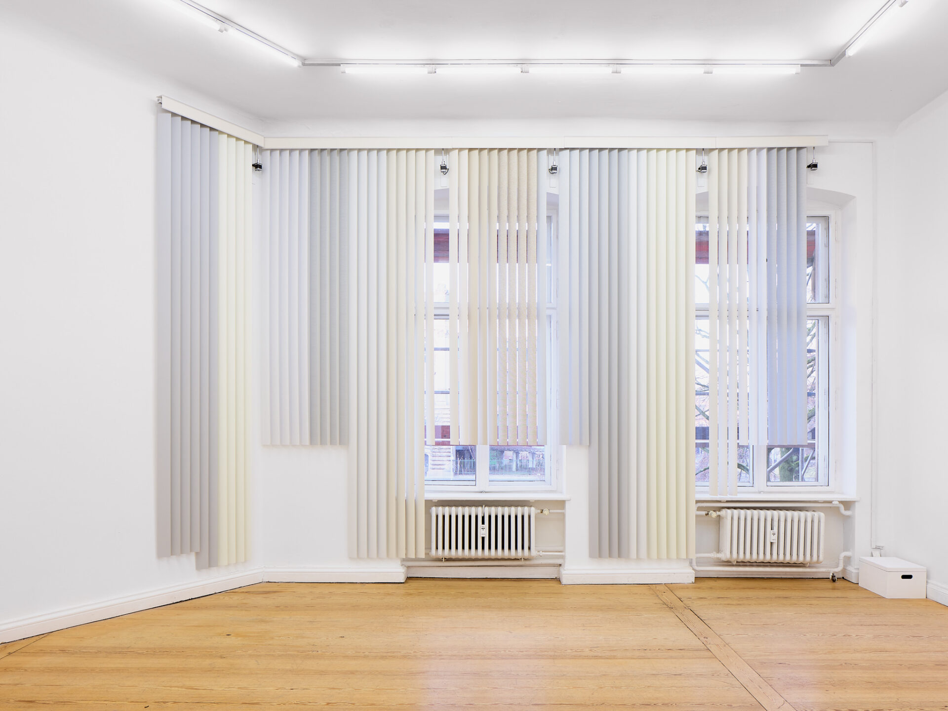 The kinetic installation How Long Is Your Winter Part 2 (2026) by Nadia Belerique extends site- specifically across the window wall of the first room, making it the first visible – yet perceptible only upon second glance – work of the exhibition. Motorized blinds block the view outside as they open and close in an opaque choreography, creating intermediate spaces that lead to shifts in perspective and changes in light or even emotional atmosphere. With closing as a gesture of withdrawal, the
