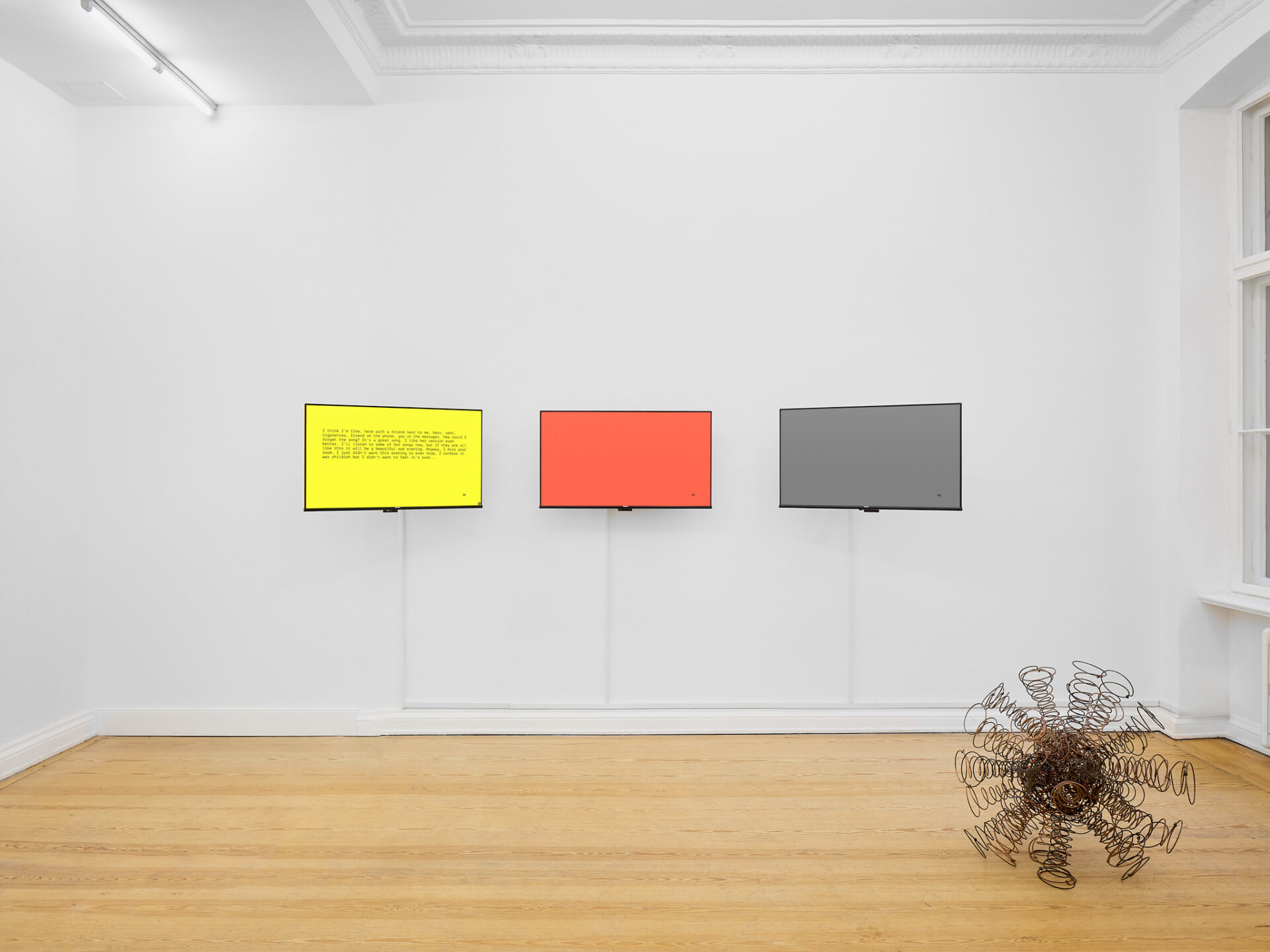 letters, as they were typically sent via email before social media and messaging apps, combining individual fragments into new, semi-fictional texts. Her analysis results in three chapters: the infatuation phase (yellow), the passionate peak phase (red), and the final phase, in which replies are delayed and a growing distance between two individuals becomes palpable (gray). The artificially generated voice-over allows us to perceive, from a detached and alienated position, how the written word is often interpreted in absurdly emotionally charged ways when we are wearing rose-colored glasses.