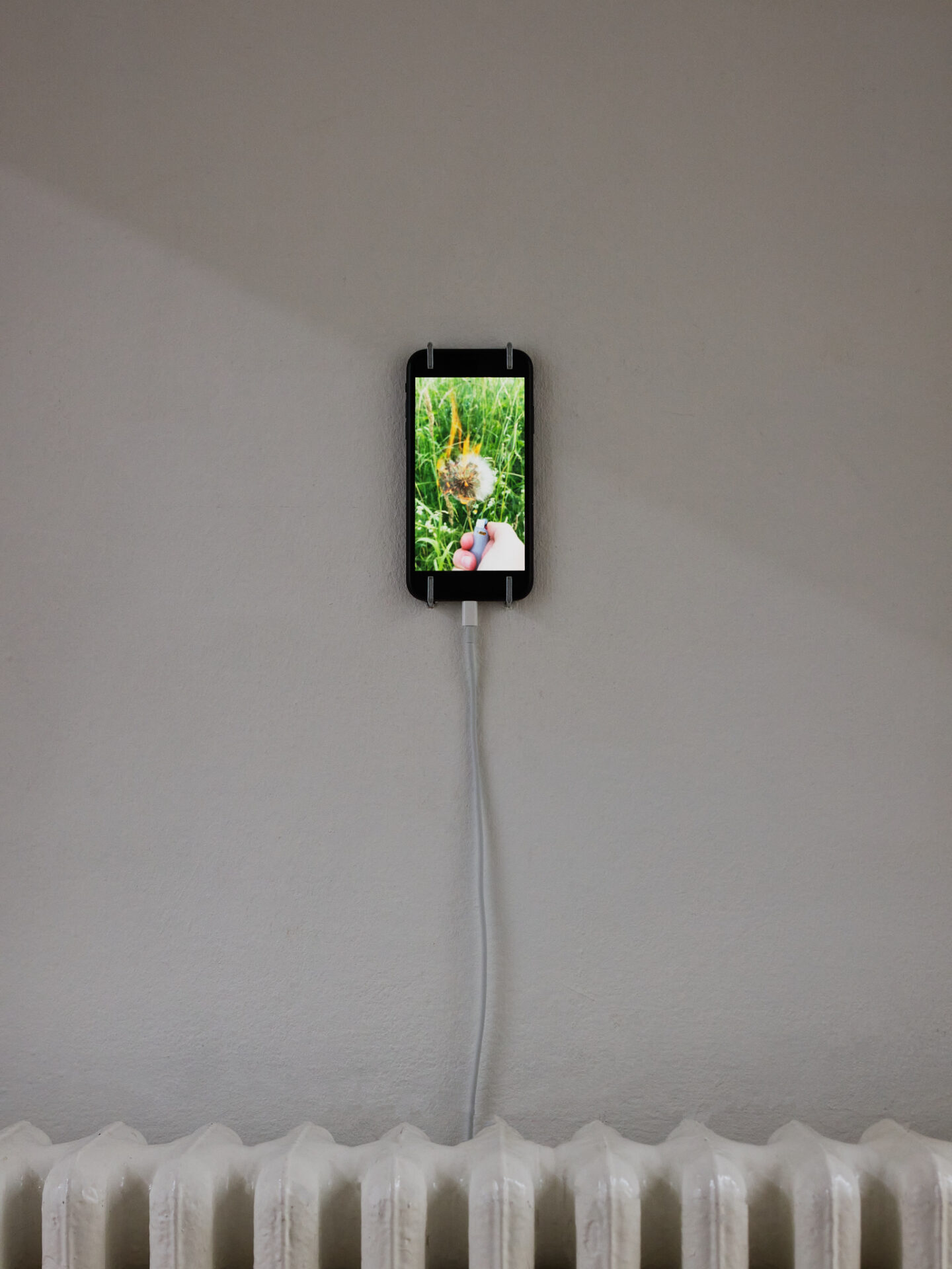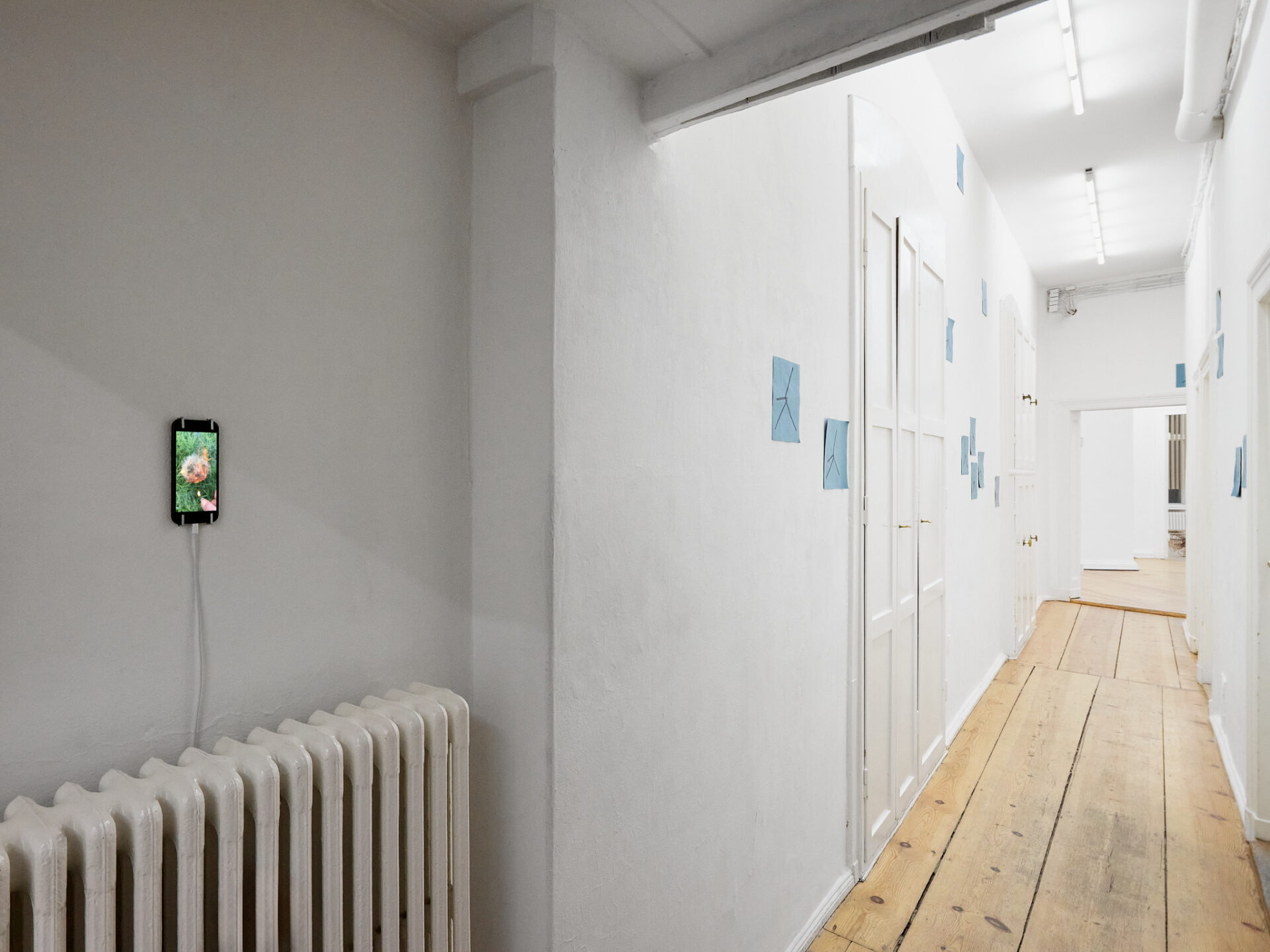 It is no coincidence that numerous video works are gathered in the exhibition, as a large part of our everyday lives today – our communication and even partner-seeking – takes place on screens. Katja Aufleger’s I’M ANGRY JUST NOT SURE ABOUT WHAT (2021), for instance, is shown on a smartphone that could itself have served as the camera for this video. We see dandelions being set alight by hand, their blazing ignition and, shortly thereafter, their extinction. Although the artist abruptly ends life in this radical act, the endless repetition suggests that there is no escape from the cycle. The work may also symbolize a certain madness, but equally the desire we can feel when caught in the midst of emotional chaos.