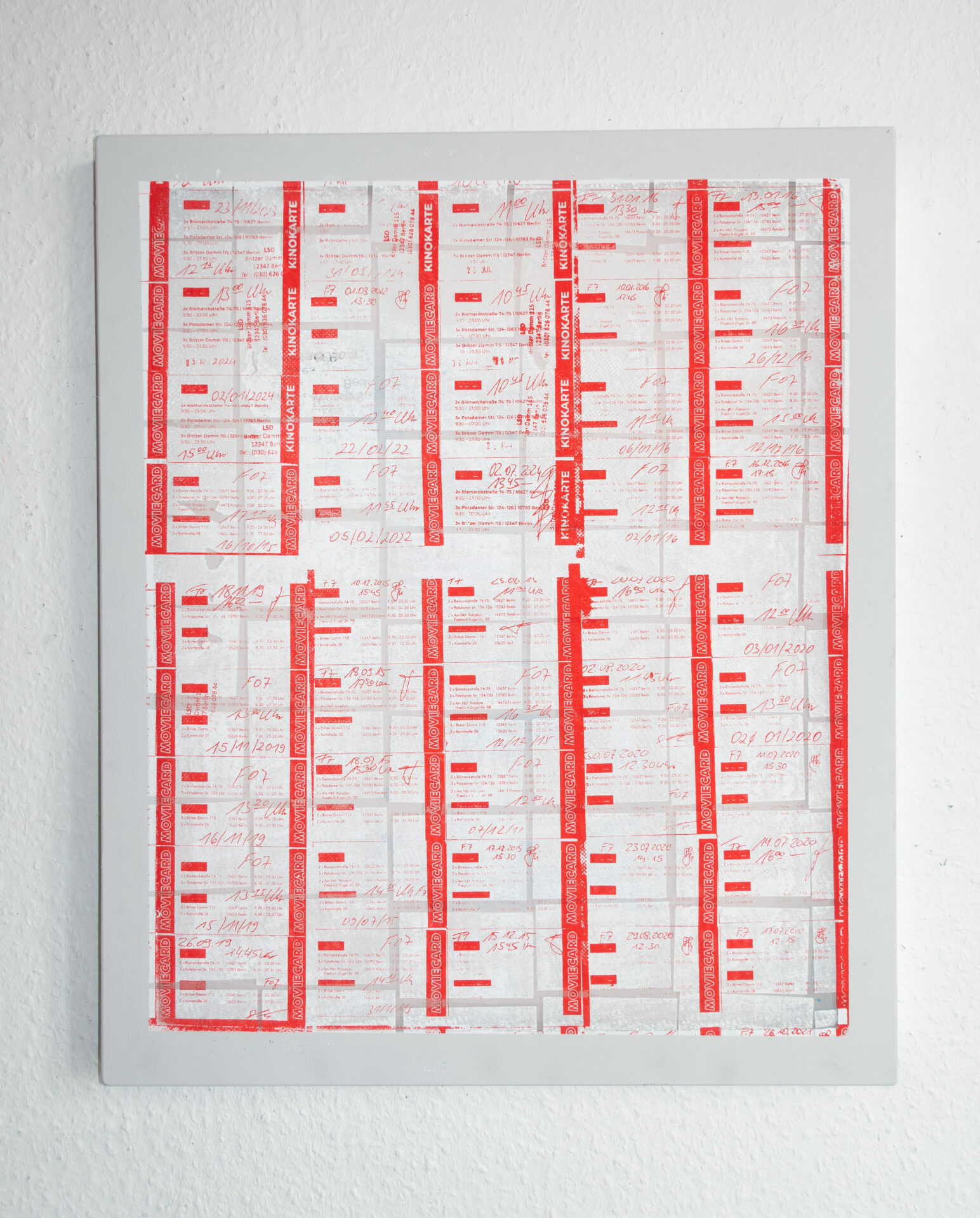 particularly those associated with rest, intimacy, and care. Reused beds, upholstered furniture, and coil springs function as silent witnesses to bodies and relationships over time. Allowing (2026) focuses on a moment of emotional learning and vulnerability, using the form of a mattress to sustain tension between attachment and letting go. Marked with the constellation of two zodiac signs, the artist dedicates this work to his first relationship, in which he allowed himself to have feelings for that person. The sculptural works of the series Aliveness (2026) are composed of springs from discarded mattresses and can move through space like tumbleweeds across the desert. His works understand love and feeling as active, mutable states. Rather than seeking resolution or closure, they explore how emotional openness persists through contact, change, and time. The Intervals (2026) by Dean Sameshima presents a fragmentary assemblage of movie tickets from Berlin porn cinemas and cruising locations near the gallery. The artist began collecting these 24-hour passes in 2015; they mark precise dates and specific moments. Over a period of ten years, they formed temporal traces into an ensemble of twelve works, in which the tickets – partly mixed with similar cards from Los Angeles – are assembled into grid-like structures. The images were screen-printed onto aluminum-framed mesh, emphasizing both their materiality and their origin in reproduction. While visiting these places can be read as a search for closeness, the act of collecting the tickets simultaneously reveals a moment of holding on to lived memories.